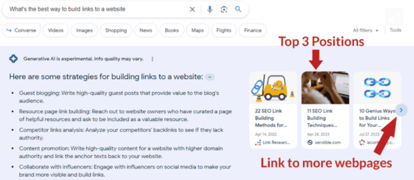 There are also some experimental SGE SERPs where Google embeds contextual links within the generated summary. Contextual links can be considered a win for sites linked within a summary because in general those kinds of links tend to get more clicks than image type links that look like ads.